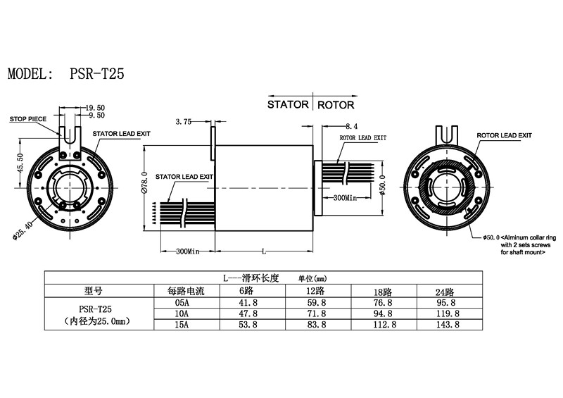 A.Position the slip ring in the desired location and tighten both set screws to the shaft.Maximum torque 25Ib-in(DO NOT OVER TORQUE) B.Route the wiring and make the neccessary connections.Do not allow the wiring to restrict free rotation of the slip ring.Do not constrain wiring such that wire flexing occurs.Doing so will ultimately cause failure(breakage of the wiring)