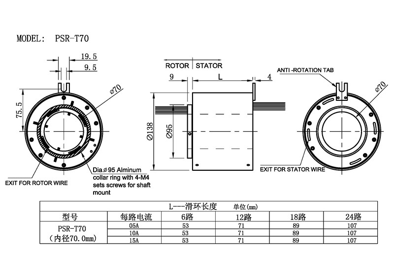 CAUTION: Because of possible geometric mismatching between the customer's application and the slip ring,'hard mouting'of both ends of the slip ring(i.e.securing the rotor and stator such that there is no floating during operation) is not recommended and may cause premature failure. |